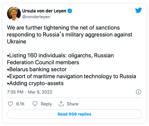 欧盟委员会主席冯德莱恩3月9日(周三)表示,欧盟已经批准了对俄罗斯的第四轮制裁,其中包括另外160名于普京有密切联系者、俄罗斯政治家和三家白俄罗斯银行。