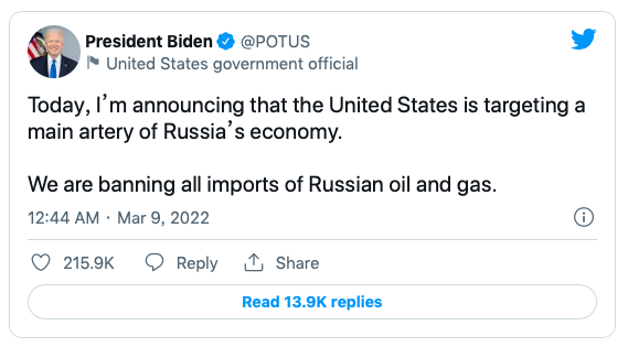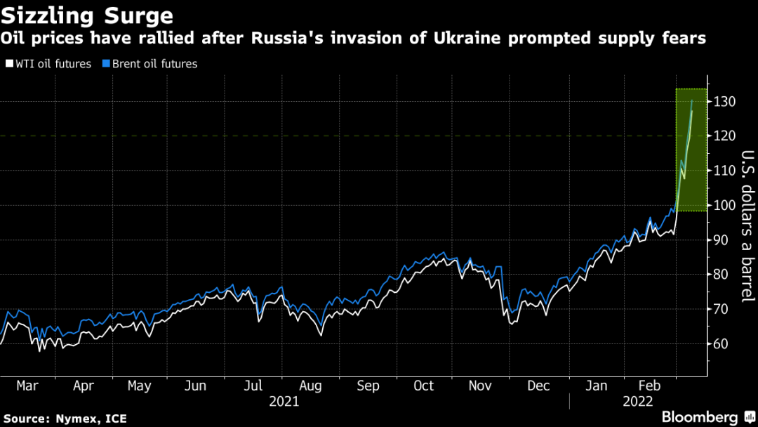 全球石油基准布伦特原油Brent crude的价格已经攀升了数周,3月7日一度创下每桶139美元的14年新高。在3月8日宣布制裁后,价格跳升了7%。