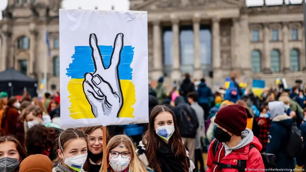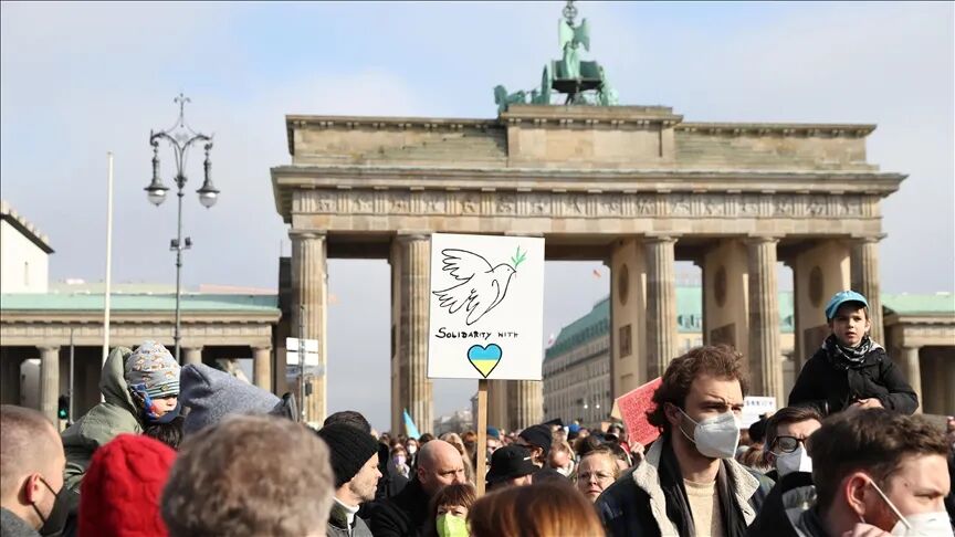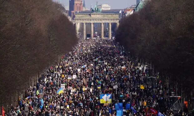 随着俄乌冲突继续,“反战游行”在各地进行。数千名群众聚集在德国柏林声援乌克兰,在市中心的勃兰登堡门Brandenburg Gate前游行。