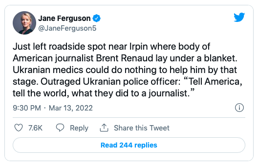 Brent Renaud遇害时在附近的PBS Newshour记者Jane Ferguson在社交媒体上说:“刚刚离开Irpin附近,美国记者Brent Renaud的尸体在一条毯子下面。乌克兰医护人员对此无能为力。愤怒的乌克兰警察说:’告诉美国,告诉世界,他们对一个记者做了什么’。”