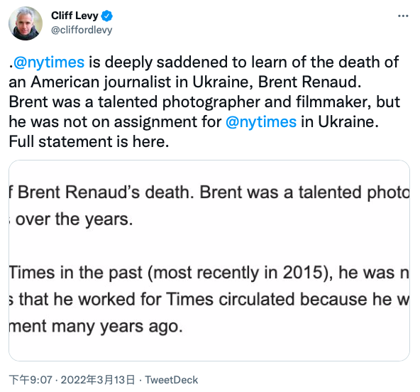 《纽约时报》副总编辑Clifford Levy则在社交媒体上发表声明澄清,Brent Renaud并非在为该报社“执行任务”。
