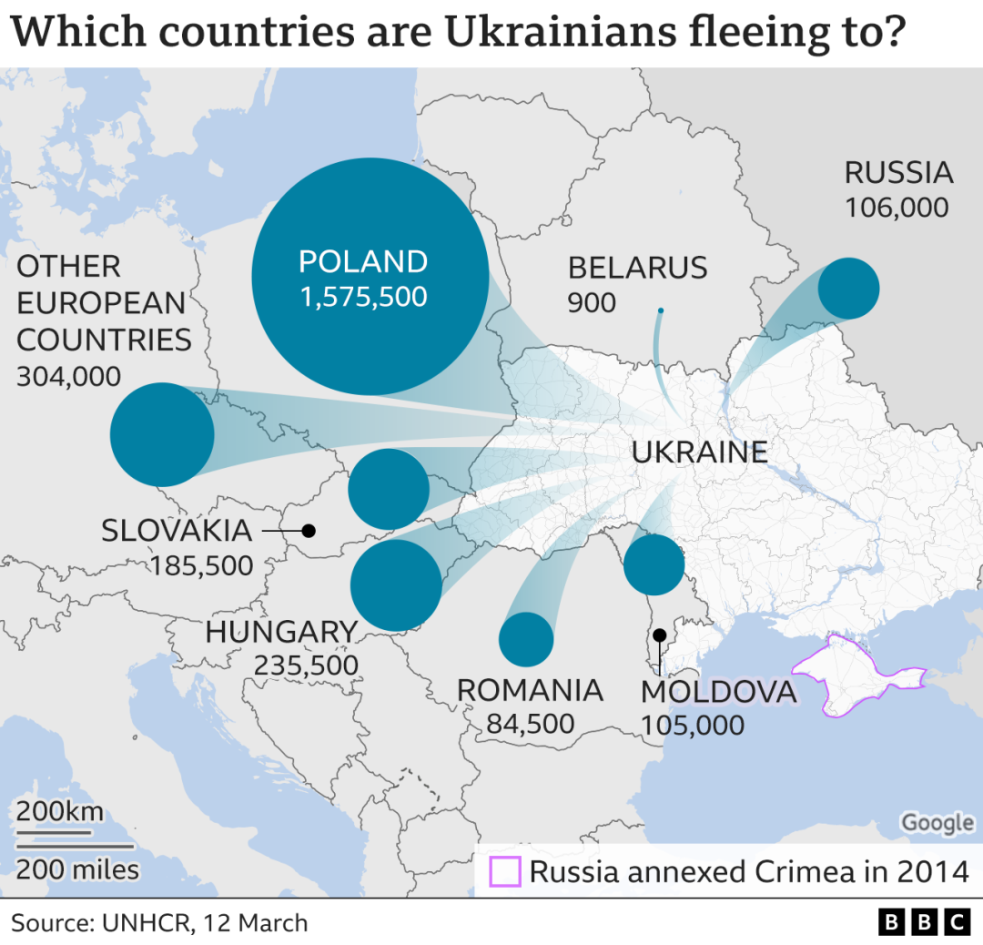 联合国难民机构称,自2月底被俄乌冲突爆发以来,已有近270万乌克兰难民逃离该国。该机构估计,如果战事继续下去,这一数字可能达到400万。