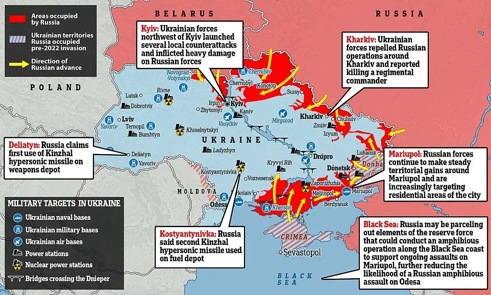 俄罗斯国际文传电讯社说,这是俄罗斯自2月24日派兵进入乌克兰以来首次部署高超音速的Kinzhal(俄语:匕首)系统。也是人类历史上首次在实战中投入高超音速武器。