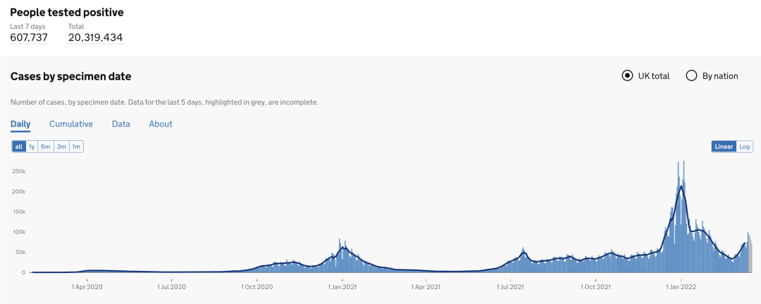 截止至2022年3月21日(周一)英国时间09:00,累计检测结果量489,207,056(+650,171);累计确诊20,319,434例(+225,624,3日累积);累计病亡163,679(+169,3日累积)。