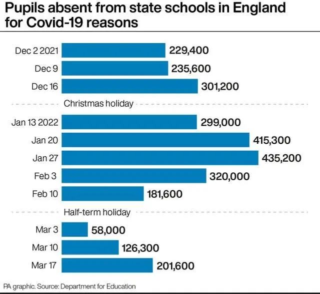 政府的最新数据显示,英格兰公立学校中因新冠相关原因缺勤的学生人数增加了两倍多,学校表示,这引发了校长们对缺勤学生成绩影响的担忧。