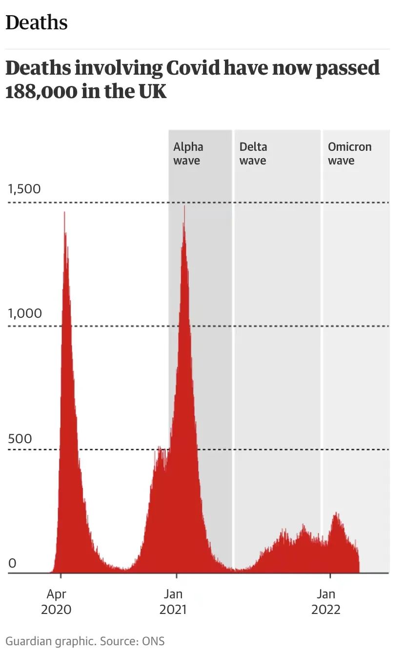 2020年3月23日,英国首相鲍里斯Boris Johnson宣布英国正式封锁。当时,新冠死亡病例刚超过1,000例。两年后今天,这一死亡数字现已超过18.8万。