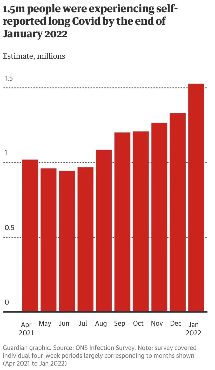 在这一群体中,估计有34.4万人(22%)在不到12周前感染新冠,110万(71%)在至少12周前感染,68.5万(45%)在至少一年前感染或怀疑感染。