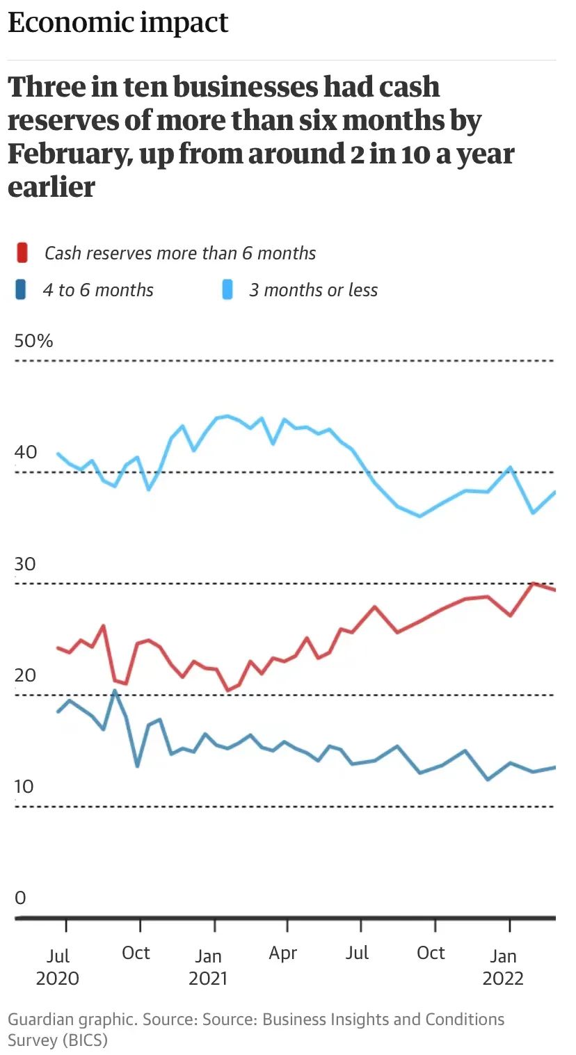 其他商业估计也显示出经济复苏的迹象。2022年2月份开放经营公司比例为94%,是2020年6月以来的最高水平。截至1月,每10家企业中就有3家拥有可维持6个月或更长时间的现金储备,比一年前的22%有所增加。