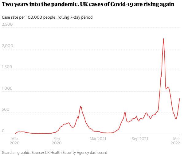 由于Omicron变种B.2型亚株,英国新冠病例率3月份出现上升,在截至3月16日的一周内,平均每10万人中有832例确诊。