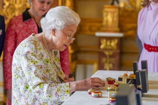 女王戴着眼镜近距离欣赏这些工艺品。并观看了工匠大师们手工制作传统珐琅和镀金的手作演示。