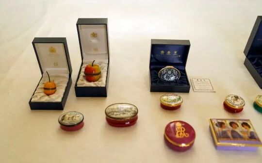 据悉,这批工艺品来自于英国皇室御用品牌之一,以纯手工“中世纪手绘烤瓷”著名的Halcyon Days。由该公司所有人Peter Harper和董事长兼首席执行官Pamela Harper带来并对女王进行介绍。
