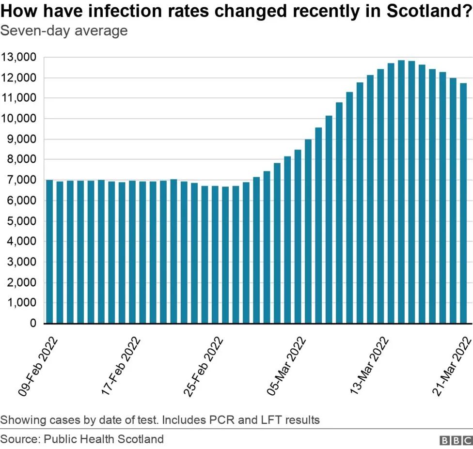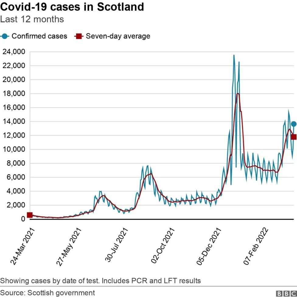 在过去的几周里,苏格兰新增病例数据激增,高传染性的Omicron变种BA.2型亚株现占该地区新增病例的约90%。