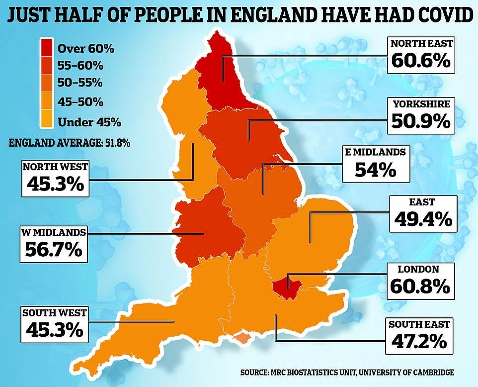 剑桥大学科学家的建模表明,截止2月23日,英格兰有51.8%的人口感染了新冠病毒。