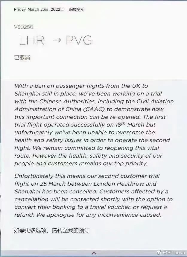 继中国驻英大使馆从3月28日(周一)起,要求英国出发赴华人员登机前最后一次核酸检测时限调整为12小时后, 维珍航空 向购票个人发布邮件信息,取消3月25日VS250由伦敦飞往上海的中英直航试运营航班。