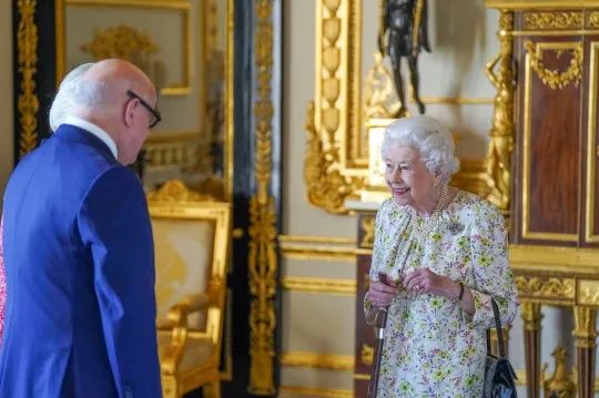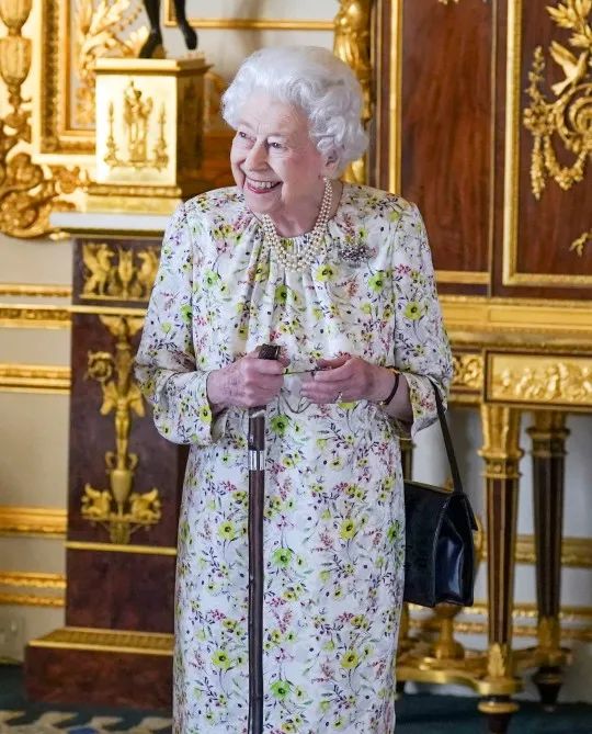 在此过程中,女王一直手持一根木质的拐杖。满脸笑容的女王看上去身体和心情都不错~