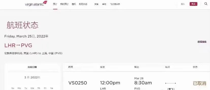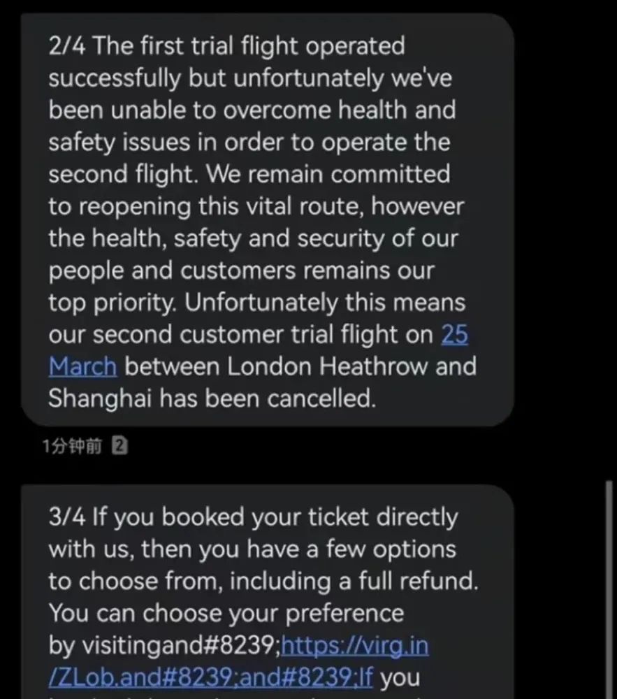 维珍航空发送的通知中表示,维珍航空3月18日首班直飞试运营航班已安全落地。但由于无法克服健康和安全等问题,第二班原计划于3月25日,伦敦希思罗-上海浦东的试运营直航航班已经取消。