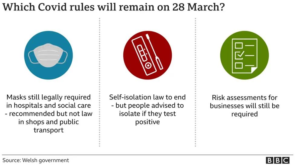从3月28日(周一)起,威尔士地区将取消对新冠检测呈阳性者的自我隔离,以及在商店、公共汽车和火车上强制戴口罩的法律要求。