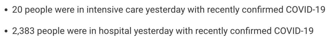 从2021年3月5日以来,苏格兰地区共有37,576名(+204)确诊患者出院。截至3月29日午夜,近期住院的疑似/确诊新冠患者2,383名(+23),其中20名(-1)确诊新冠在重症监护室ICU。