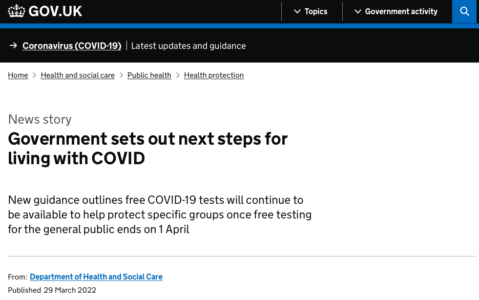 根据英国卫生大臣Sajid Javid于3月29日(周二)宣布的最新“与新冠共存”指南,其概述了在4月1日(周五)对公众的免费PCR核酸检测以及横向测流快速检测结束后,将继续为特定群体提供以上免费检测的具体细节。