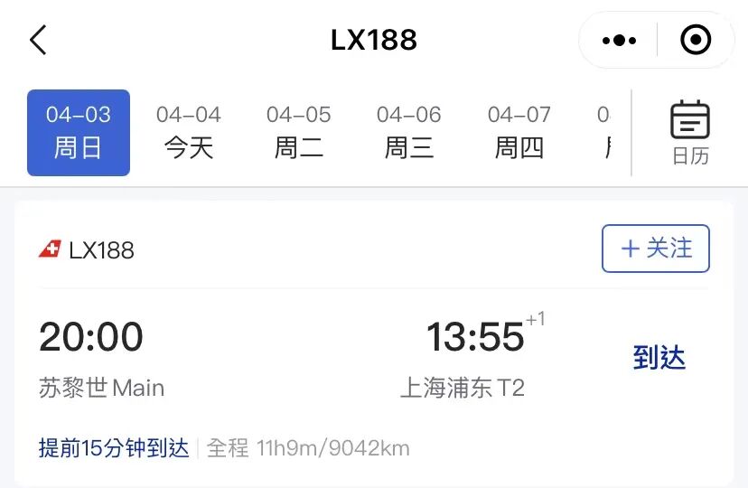4月3日(周日)瑞士苏黎世-上海浦东的航班也是瑞航熔断前的最后一班回国航班。