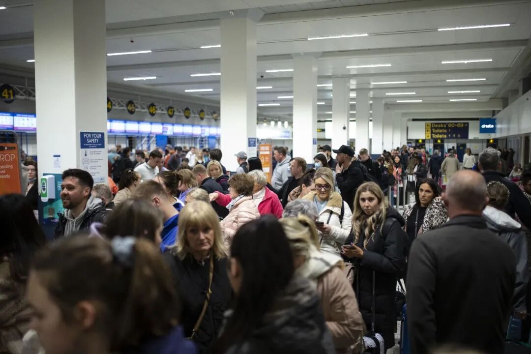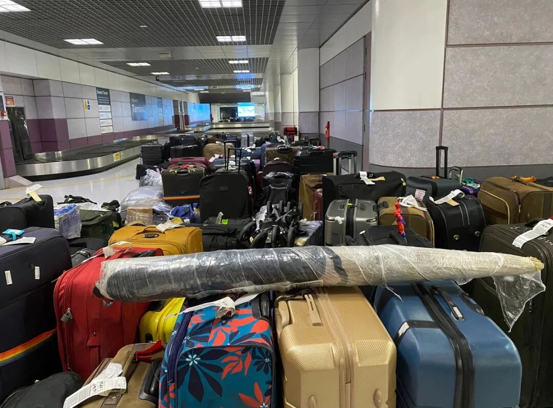 机场出现了堆积如山的行李箱。许多乘客抱怨,需等待数小时才能取到行李,许多人不得不先回家,之后再等待取行李的通知。