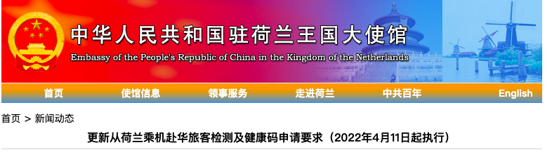 中国驻荷兰大使馆于4月1日发布最新《荷兰乘机赴华旅客检测及健康码申请要求》。自2022年4月11日起(以赴华航班从荷兰起飞日期为准),具体要求更新如下: