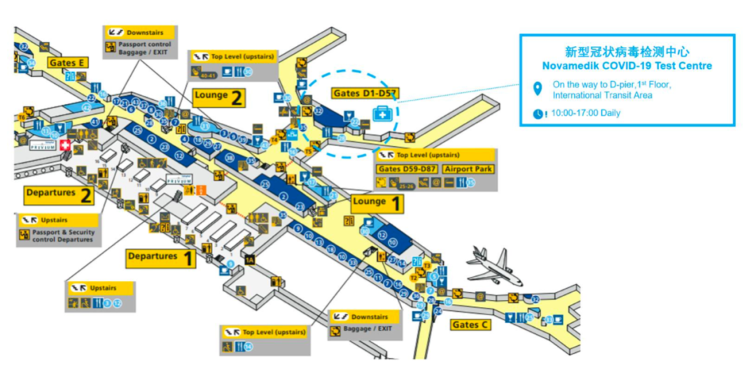 该检测中心位于D10登机口 ,机场示意图以及各项检测费用如下: