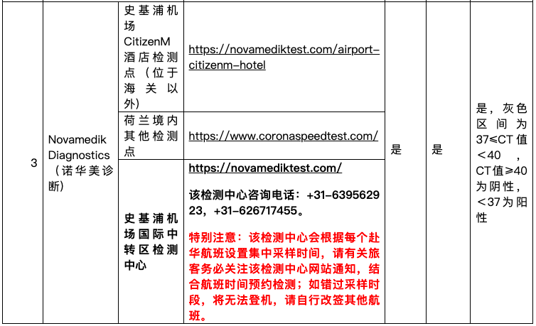 鉴于时限要求,史基浦机场国际中转区诺华美检测中心仅能提供有限规模的检测。所有从第三国始发、途经荷兰中转赴华,需在机场检测中心检测的旅客,必须提前向该检测中心确认预约检测名额。