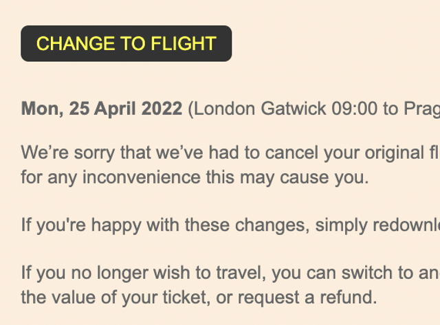 旅客收到的短信显示,4月25日,从伦敦盖特威克机场飞往布拉格的晚间航班已被取消,该航班将被更改至早上9点。乘客可以或选择飞其他航线、获得代金劵或进行全额退款。