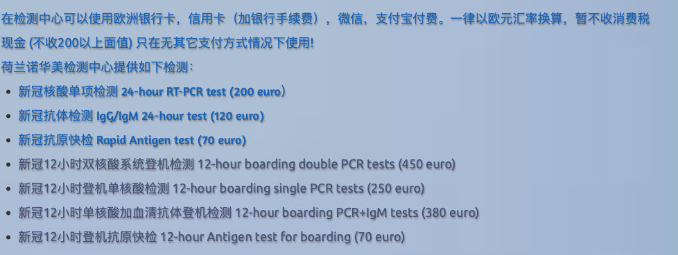 以下登机前48小时、24小时、12小时均以航班计划起飞时间计算,严格精确到分钟,超出时限的检测一律无效。且所有检测均须在中国驻荷兰大使馆指定机构进行。