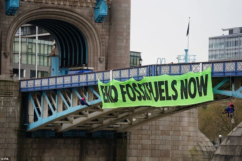 伦敦塔桥在抗议示威者挂上”立即结束化石燃料”(End fossil fuels now)的横幅后被关闭。