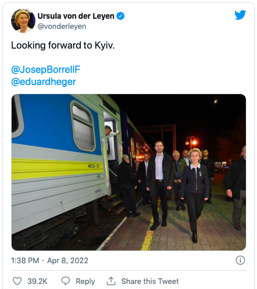 欧盟委员会主席冯德莱恩和该集团的高级外交官Josep Borrell正在前往乌克兰首都基辅的途中。冯德莱恩4月8日(周五)在其社交平台上发布了一张她与斯洛伐克总理Eduard Heger一起走上火车的照片。并配文:“期待基辅”(Looking forward to Kyiv)。