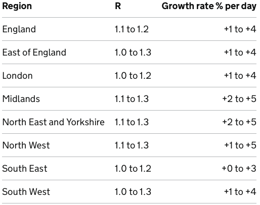根据英国卫生安全局的数据,英格兰感染率R值与上周相比保持不变。在1.1-1.2之间,这意味着每10个被感染的人,平均会继续感染11-12个其他人。感染者的日增长率在1-4%之间。