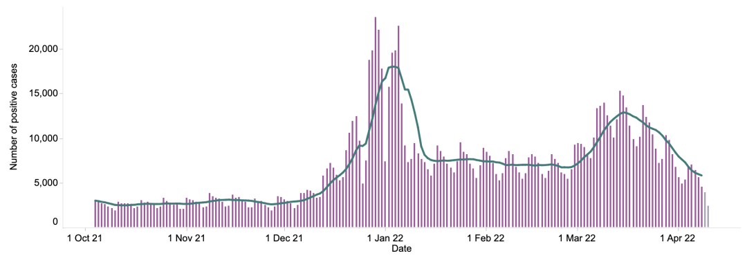 国家统计局(ONS)数据显示,在截至4月2日的一周内,英格兰有410万人被感染,相当于7.6%的人口,是监测调查以来的最高记录。比前一周增长约0.5%。