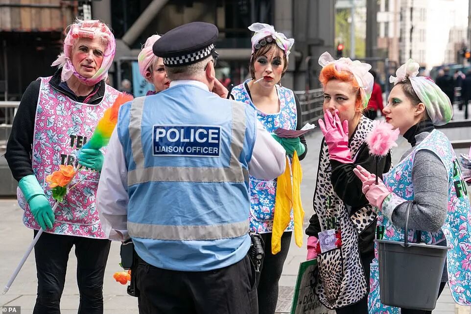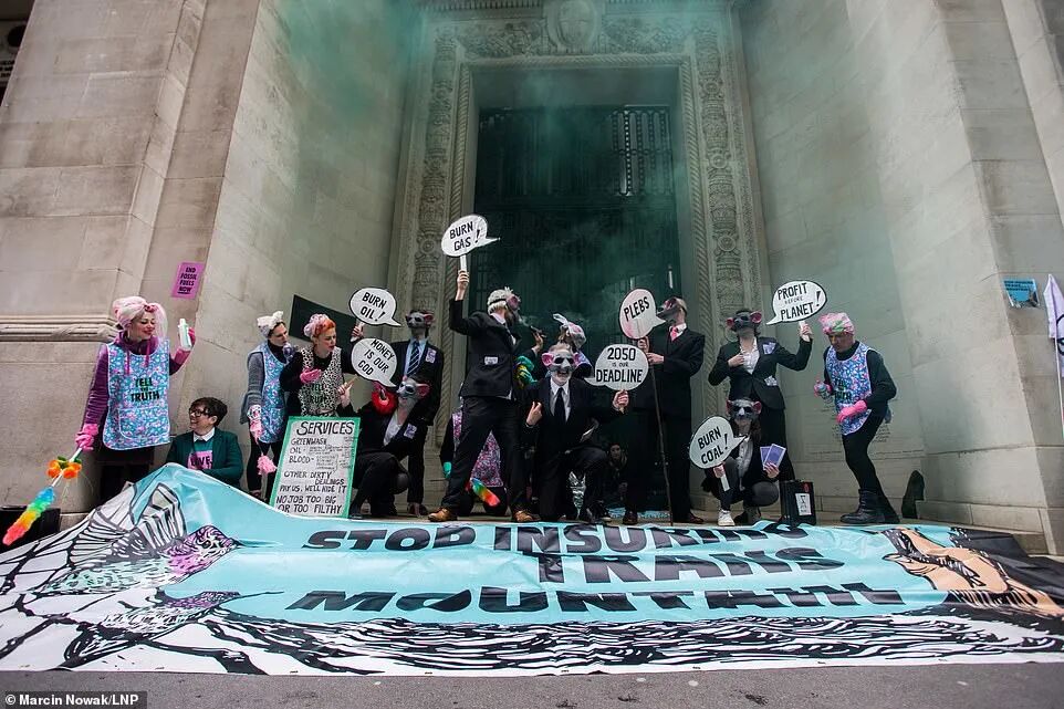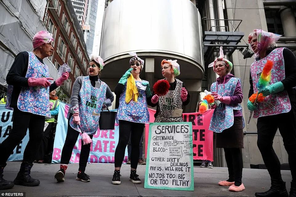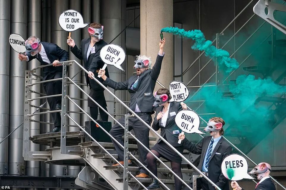 部分抗议者打扮成“西装革履的老鼠”、造型夸张的清洁工,声称该公司将“利润置于地球家园之上”。