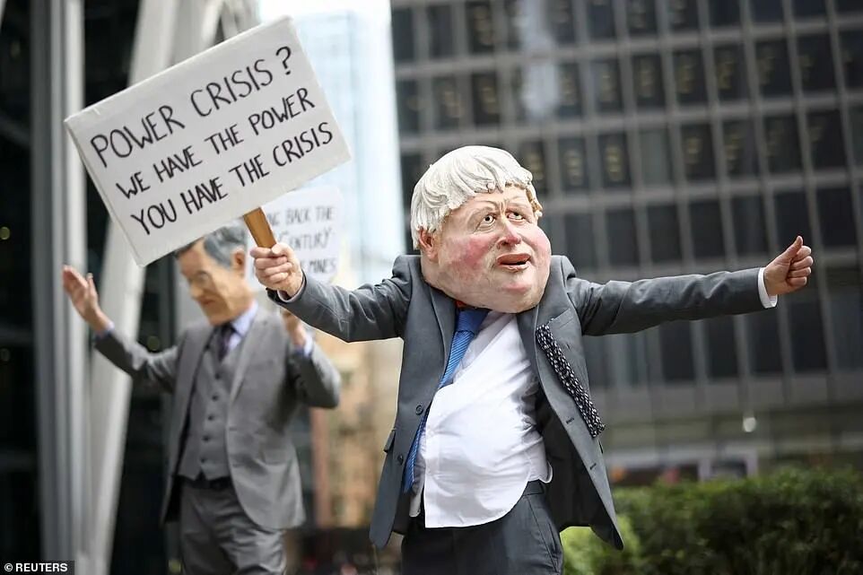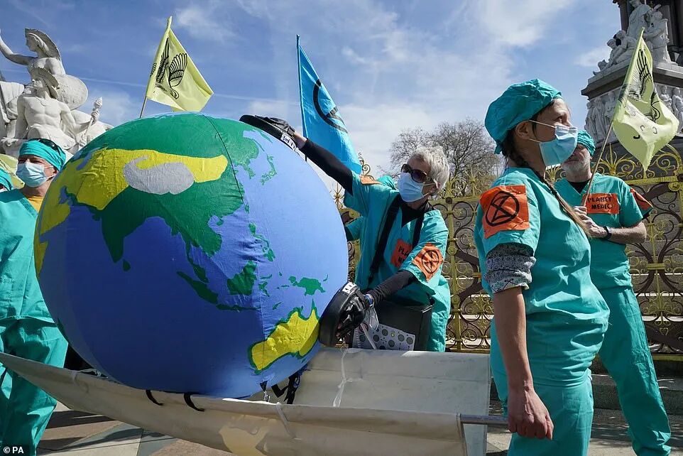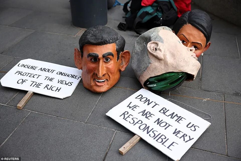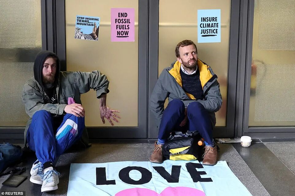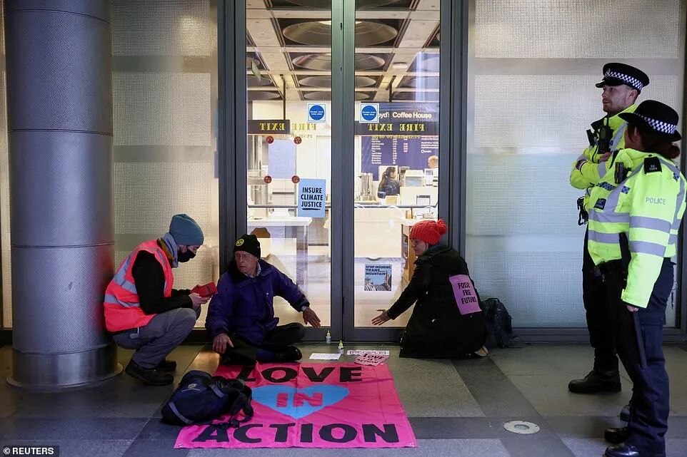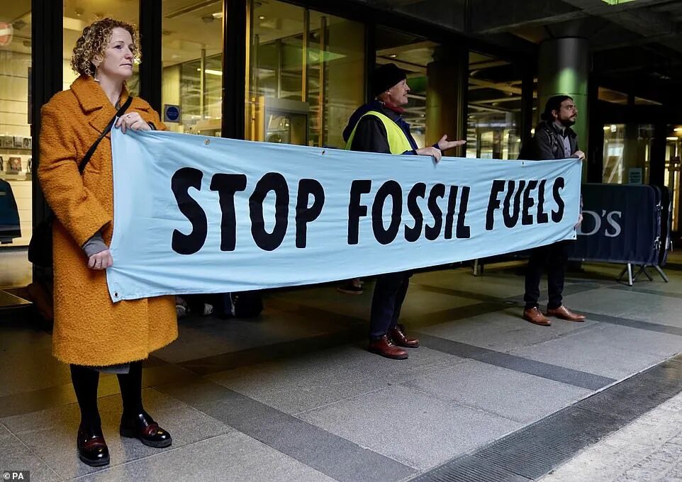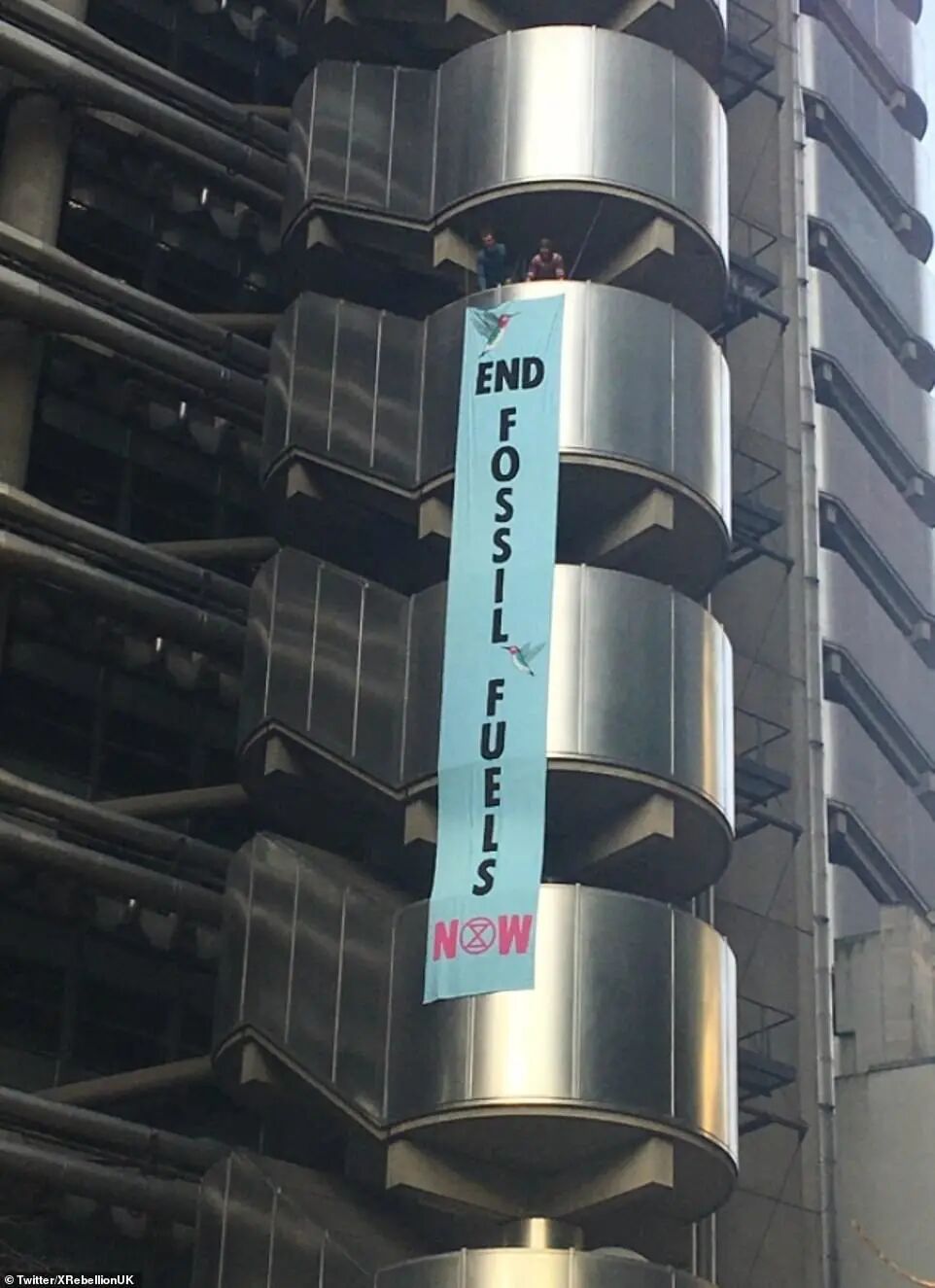 Extinction Rebellion组织成员拉起抗议横幅,用胶水、链条和自行车锁封锁了进出大楼的道路。部分示威者爬上大楼外墙,展开写着“立即结束化石燃料”的横幅。