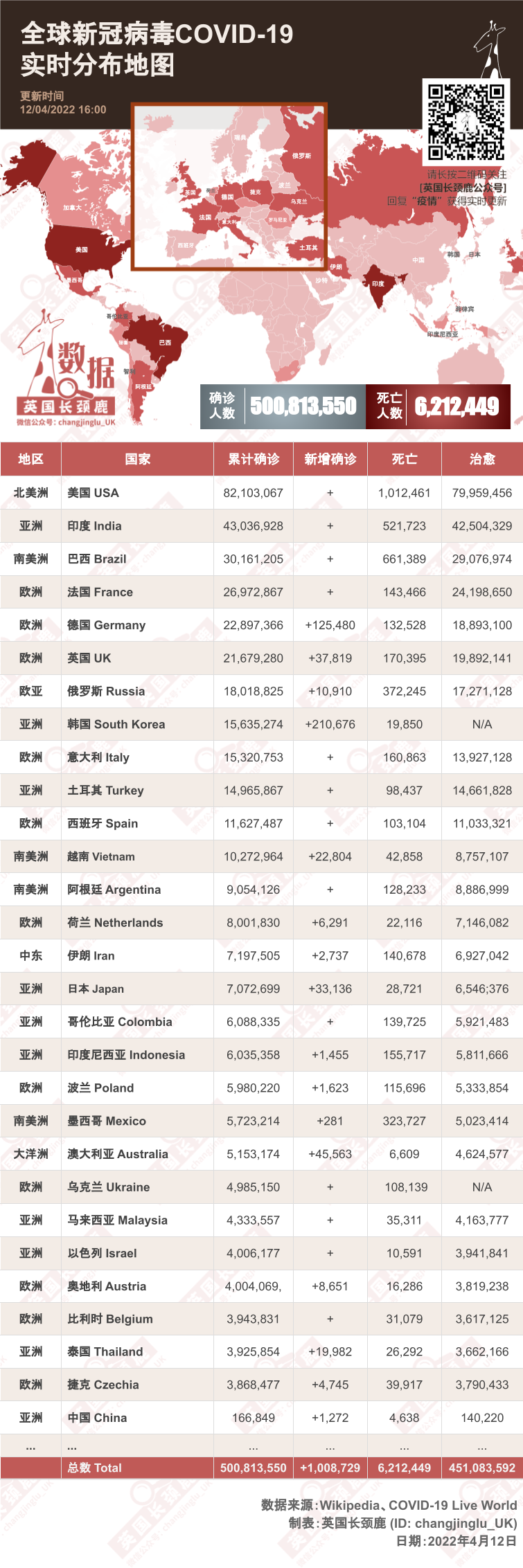 世界的累计确诊人数截止2022年4月12日17:00超过5亿81万例(*),死亡超过621.2万例(*)。