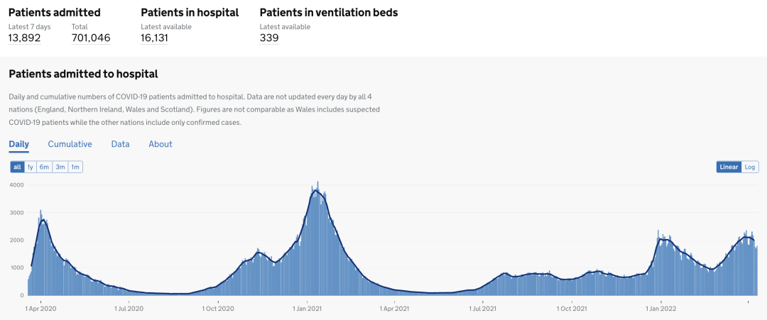 目前英格兰地区使用呼吸机的新冠患者有339人(+2);病亡新冠患者总计148,080人(+1,301)。