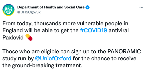通过牛津大学领导的PANORAMIC研究,英格兰数千名新冠感染者将获得辉瑞Pfizer公司口服新冠抗病毒药物 Paxlovid的治疗。早前,已有6,000名感染者得到治疗,且症状在服用后“几小时内”出现好转。