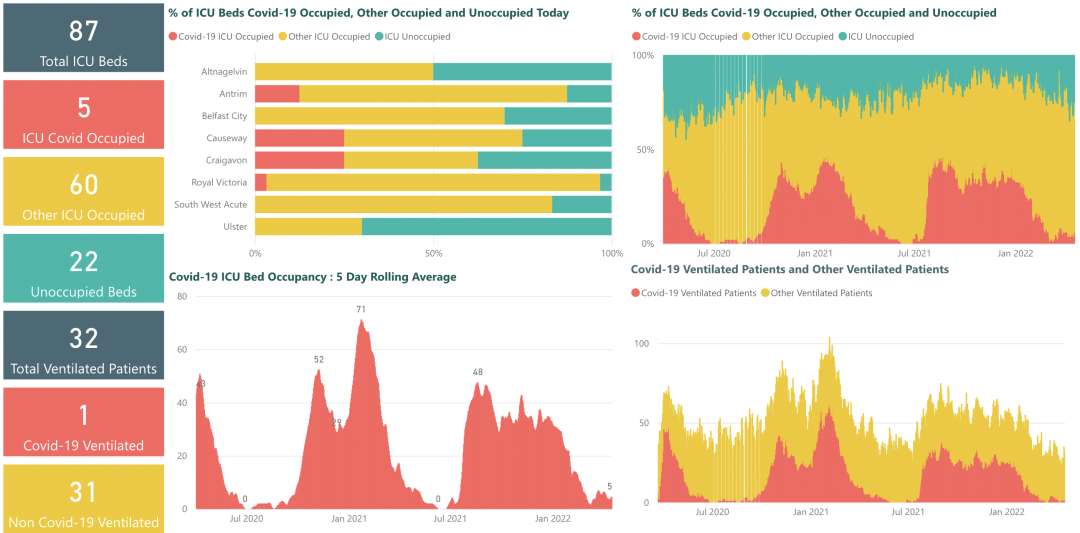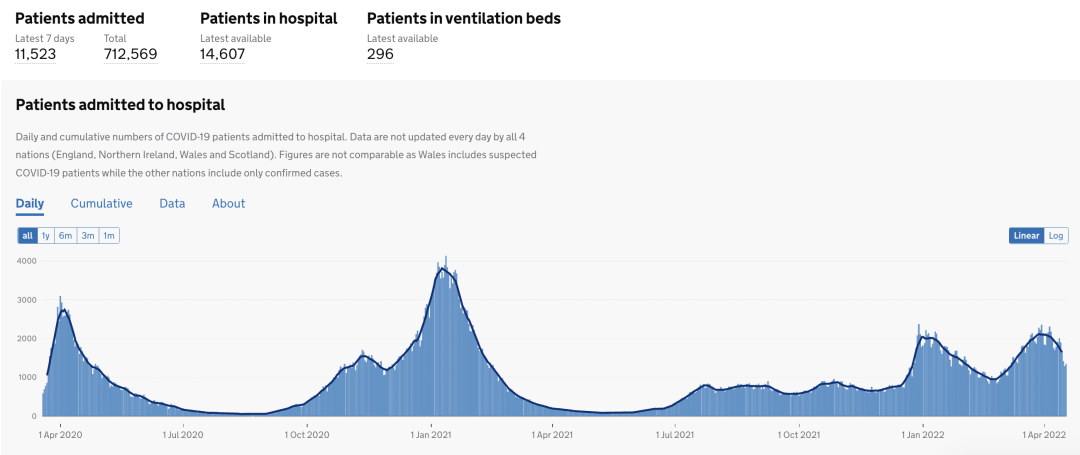 从2021年3月5日以来,苏格兰地区共有累积新冠入院患者60,219名(+178)确诊患者出院。截至4月19日午夜,近期住院的疑似/确诊新冠患者1,833名(-143),其中16名(-4)确诊新冠在重症监护室ICU。