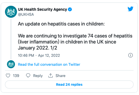 根据世卫组织(WHO)4月5日发布的一份新闻稿,苏格兰公共卫生官员通报了10例10岁以下儿童严重肝炎及肝脏炎症。自2021年1月2日以来,全英报告了74例相关病例。