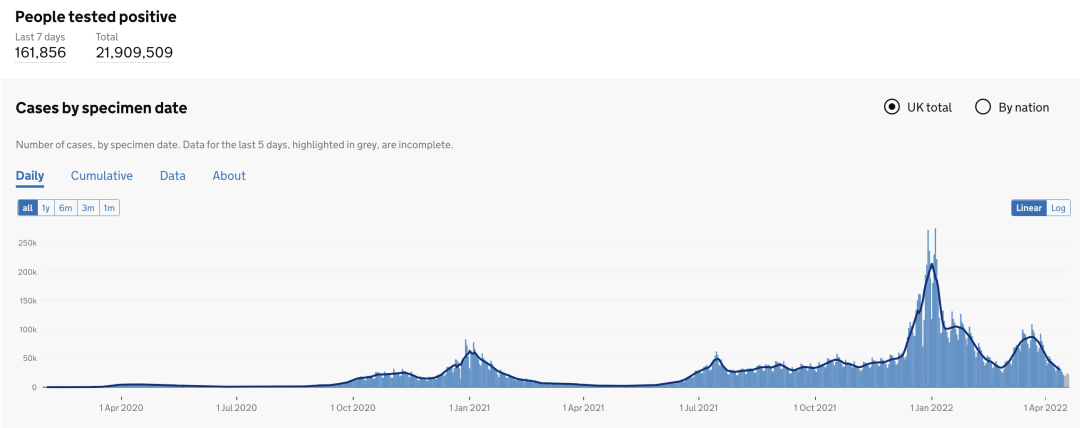 截止至2022年4月21日(周四)英国时间09:00,累计检测结果量506,288,096(+345,927);累计确诊21,909,509例(+19,482);累计病亡173,032(+646)。