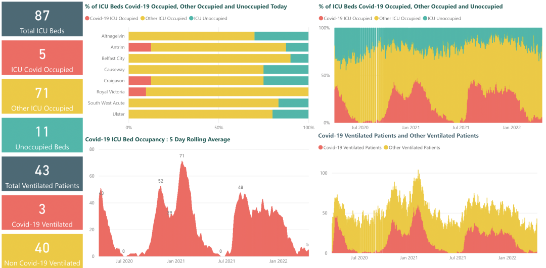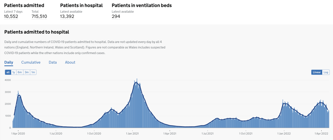 从2021年3月5日以来,苏格兰地区共有累积新冠入院患者60,893名(+674)确诊患者出院。截至4月21日午夜,近期住院的疑似/确诊新冠患者1,819名(-14),其中14名(-2)确诊新冠在重症监护室ICU。