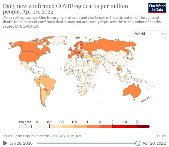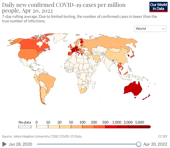 世界的累计确诊人数截止2022年4月21日17:00超过5亿722万例(*),死亡超过623.3万例(*)。