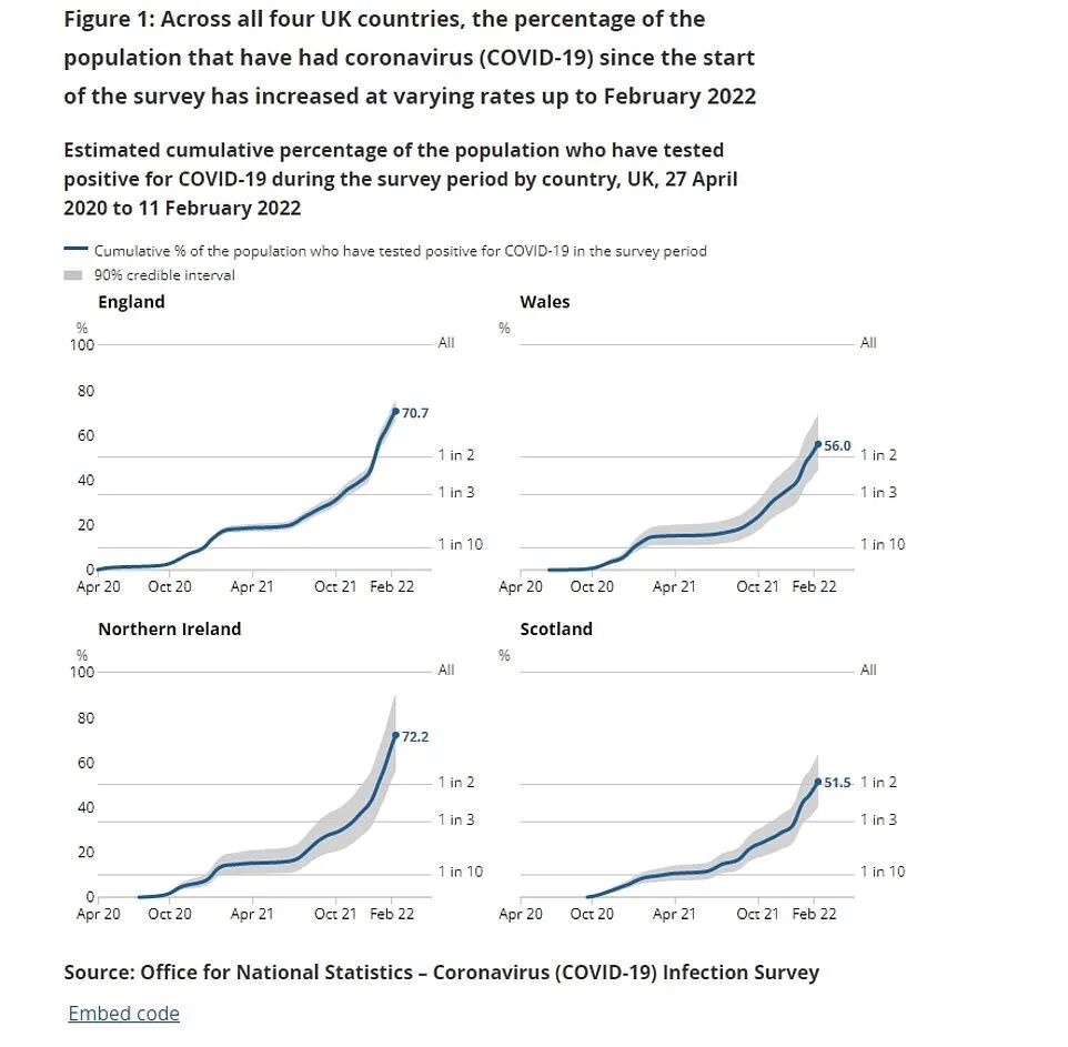 2020年7月27日至2022年2月11日之间,北爱尔兰有130万感染,占地区人口的72.2%;