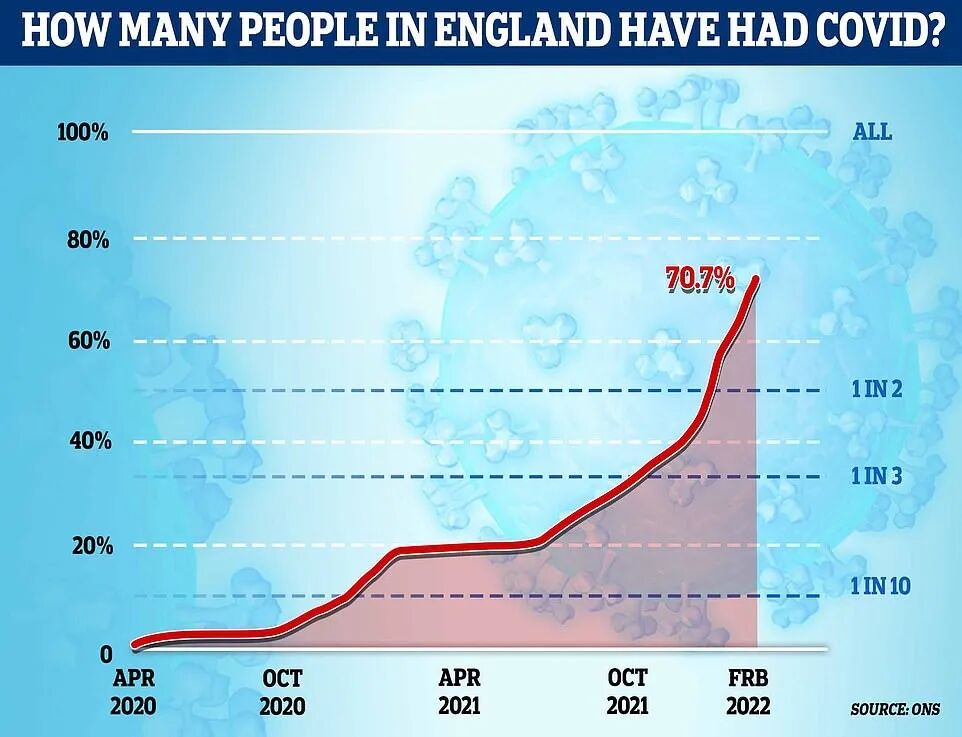 根据国家统计局(ONS)官方统计数据估计,在2020年4月27日至2022年2月11日期间,英格兰地区有3,850万人感染新冠,相当于总人口的70.7%。