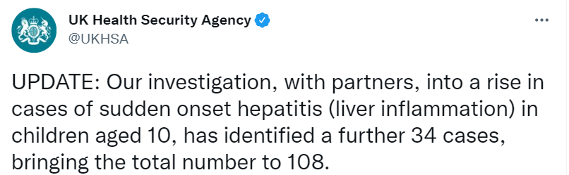 英国卫生安全局表示,在目前确诊并参与检查的108例儿童肝炎病例中,77%对腺病毒呈阳性。但引起传染性肝炎的常见病毒(A至E型肝炎)没有被检测出来。