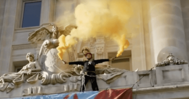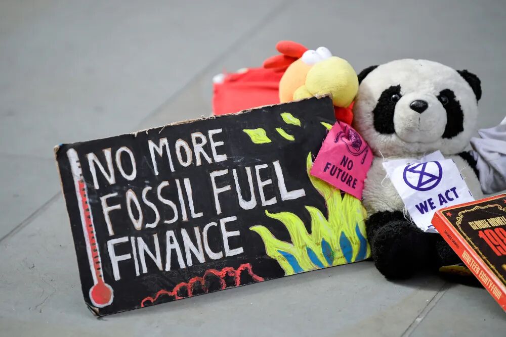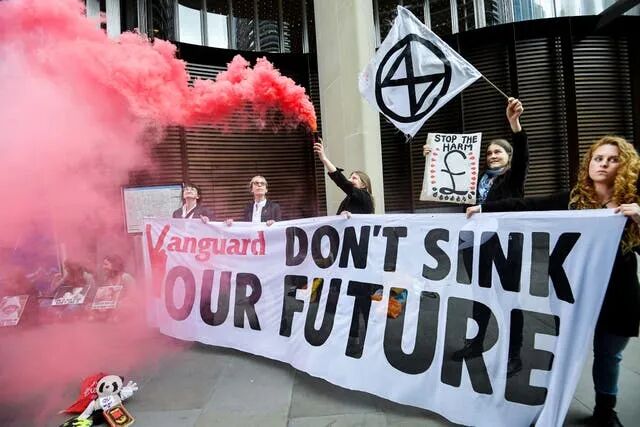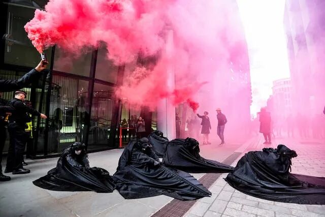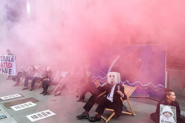 游行示威者聚集在资产管理公司Vanguard的伦敦办公室外,数十名戴面具的抗议者坐在自带躺椅上,点燃信号弹。