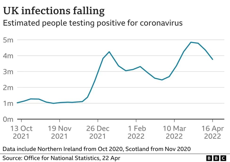 根据国家统计局(ONS)的新数据,英国目前感染新冠病毒的人数正在继续下降。在截至4月16日的一周内,处于新冠活跃状态的约有376万人,约每17人中就有1人感染。比前一周下降了约15%(440万)。