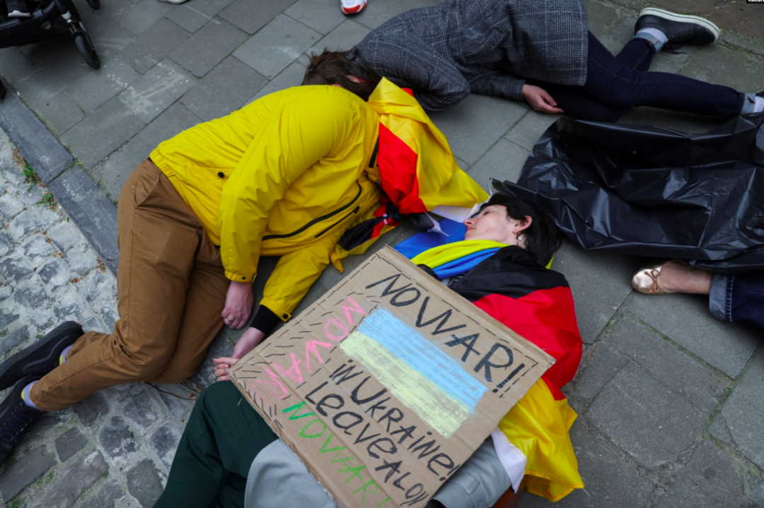 大约50名活动人士在德国驻布鲁塞尔欧盟代表处外高呼“像乌克兰一样勇敢”,一些人躺在地上伪装成“尸体”,身上裹着乌克兰国旗和涂成血色的衣服。